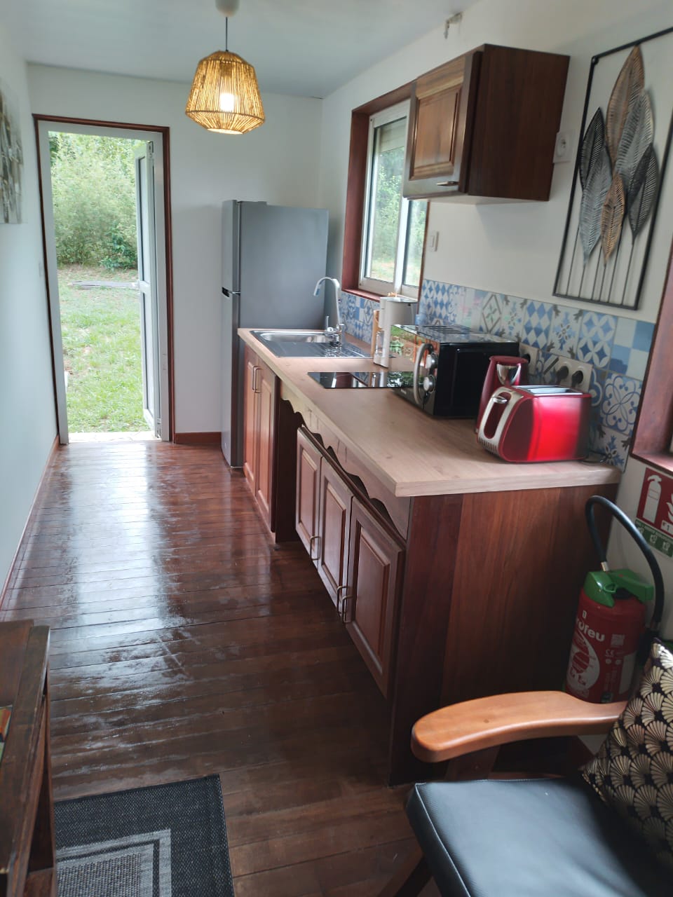 - d’une cuisine entièrement équipée (frigo, plaque électrique, four micro-ondes, cafetière électrique, grille-pain, bouilloire)