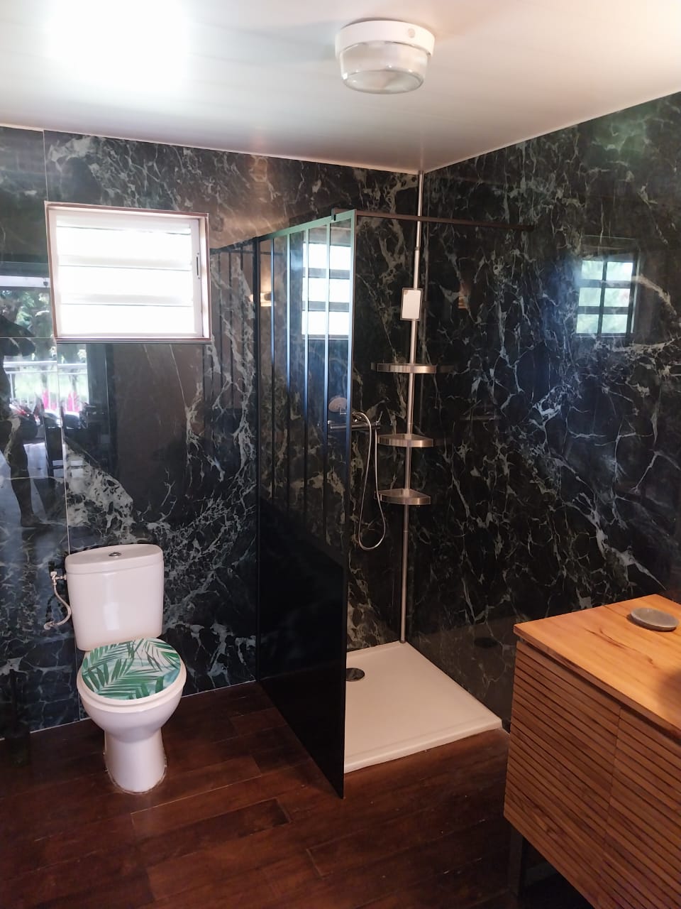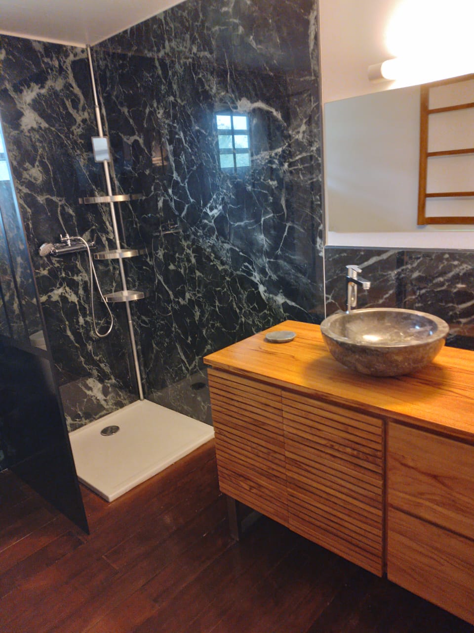 - d’une salle de bain équipée avec une grande douche moderne